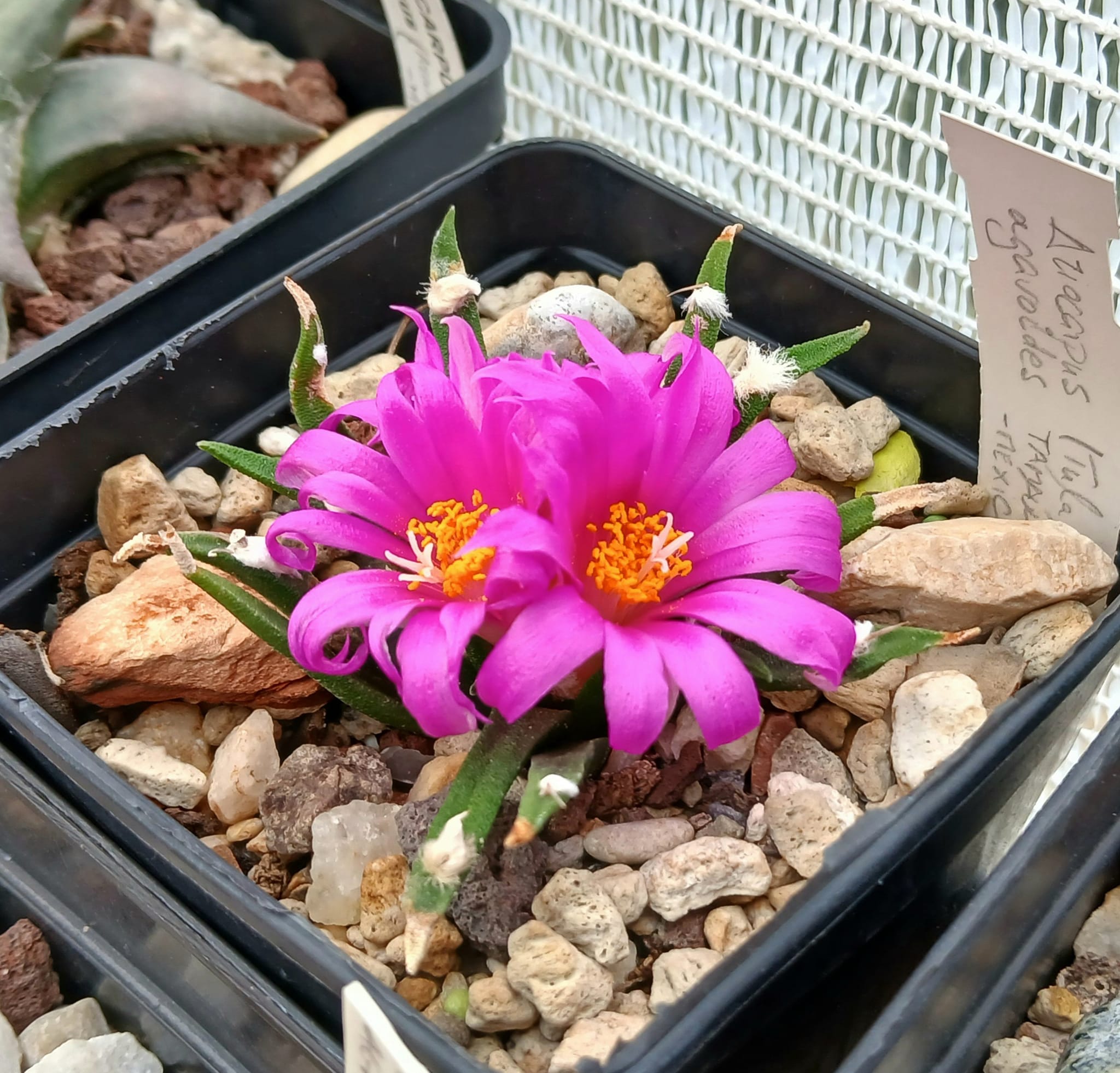 Young Ariocarpus agavoides seedlings in propagation showing early tubercle development and spine retention unlike other Ariocarpus species