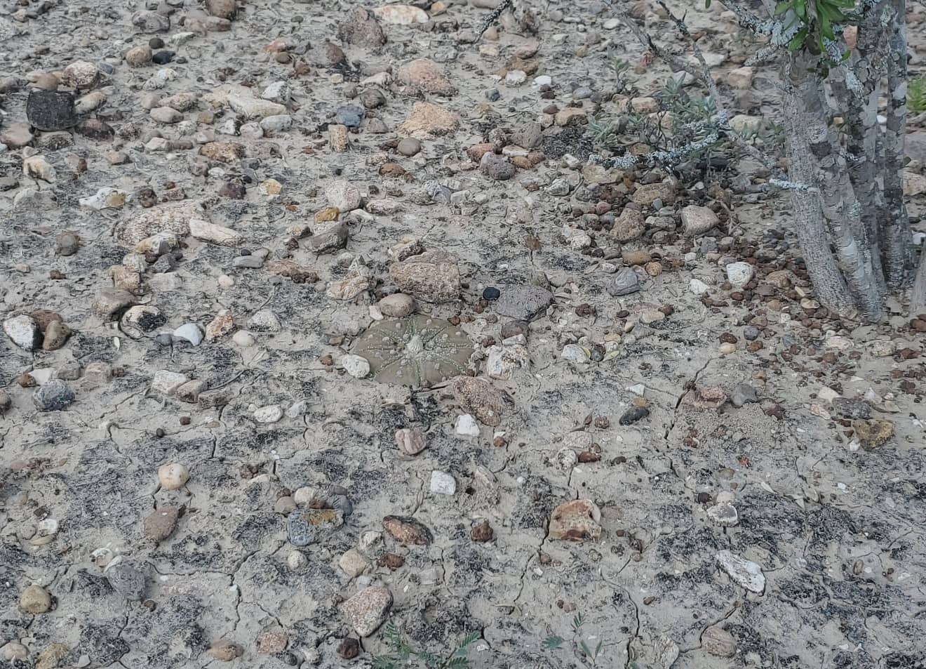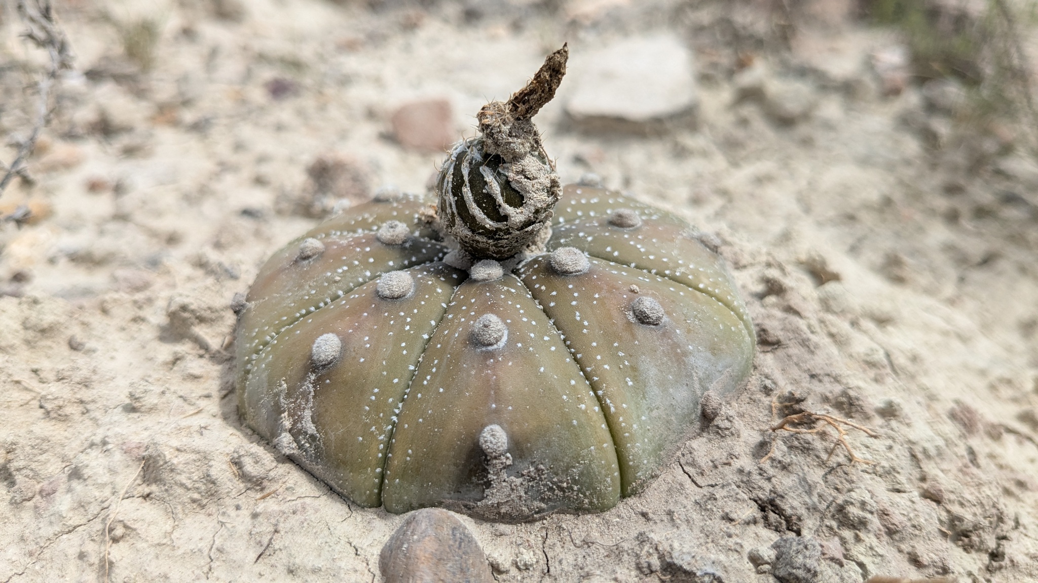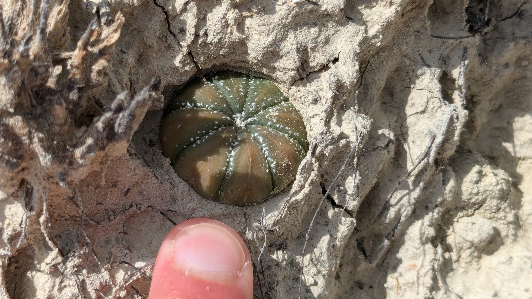The plant grows flush with the soil surface between brushy thorn shrubs, using the semi-protected pockets under mesquite (Prosopis), blackbrush (Acacia rigidula), and associates like Opuntia leptocaulis, Mammillaria heyderi, Thelocactus schwarzii, and Homalocephala texensis. The turnip-like taproot contracts during drought and the whole body retracts below the surface, which makes the species close to invisible in dry years and is a real field-survey problem.