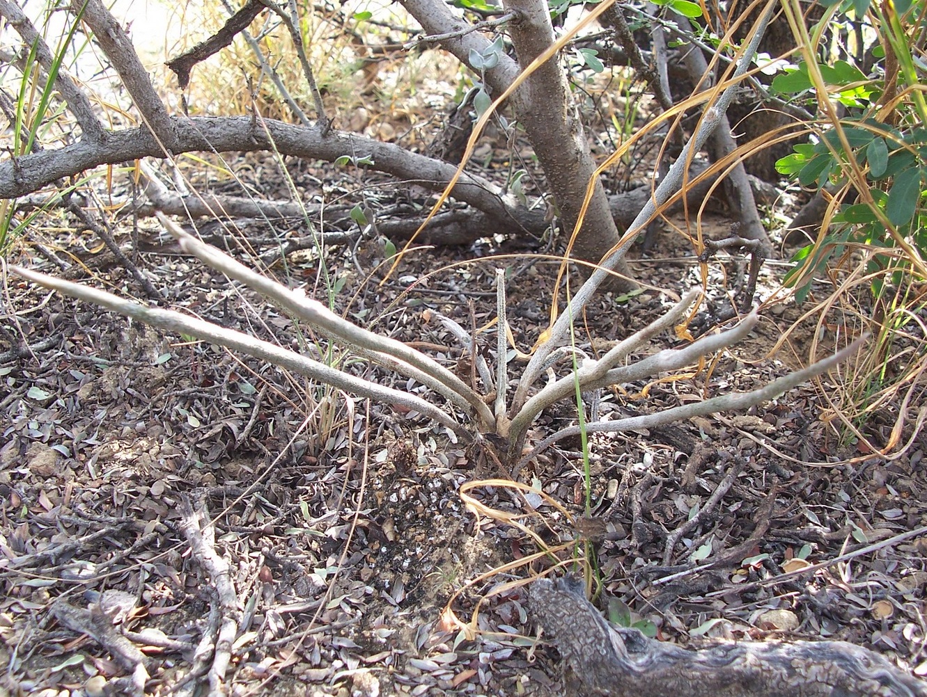 The defining microhabitat character is shade. Plants grow at the base of thornscrub shrubs in a partially shaded position, not in open sun. The matrix vegetation includes Prosopis spp. (mesquite), Acacia, Celtis, and Condalia, with seasonal grasses that may camouflage the grey-white tubercles among dry grass stems and shrub-base litter. This shade preference is the most consequential fact about the species for cultivation: every other Astrophytum in the genus is a full-sun plant.