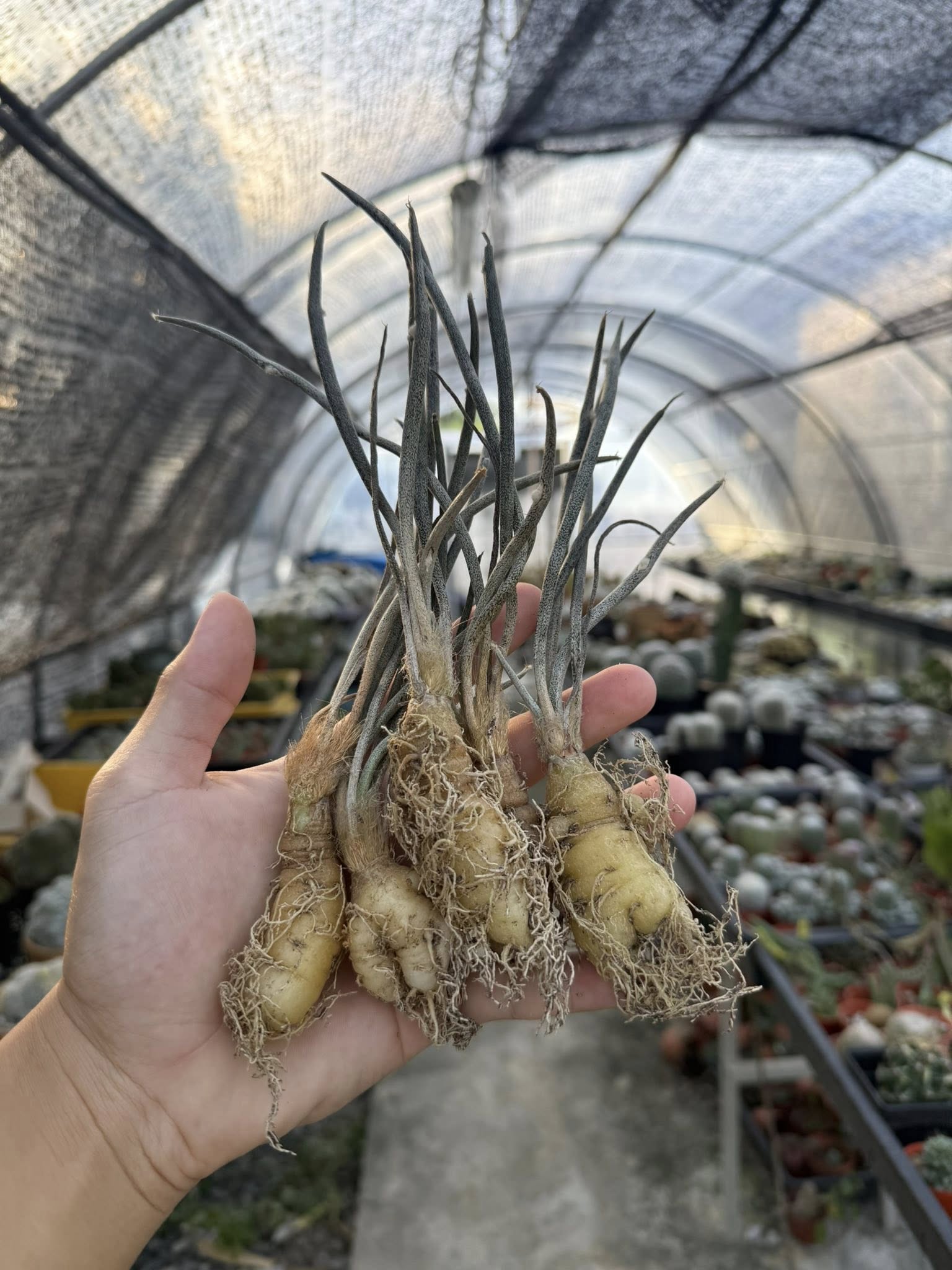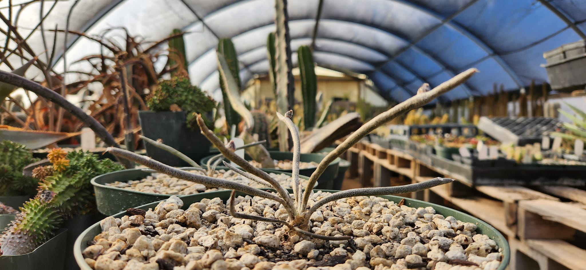 Deep pots are required. The primary root is fusiform and fleshy, comparable in extent to the above-ground tubercle mass. Shallow containers constrain root development and make the plant unstable as the tubercles extend.