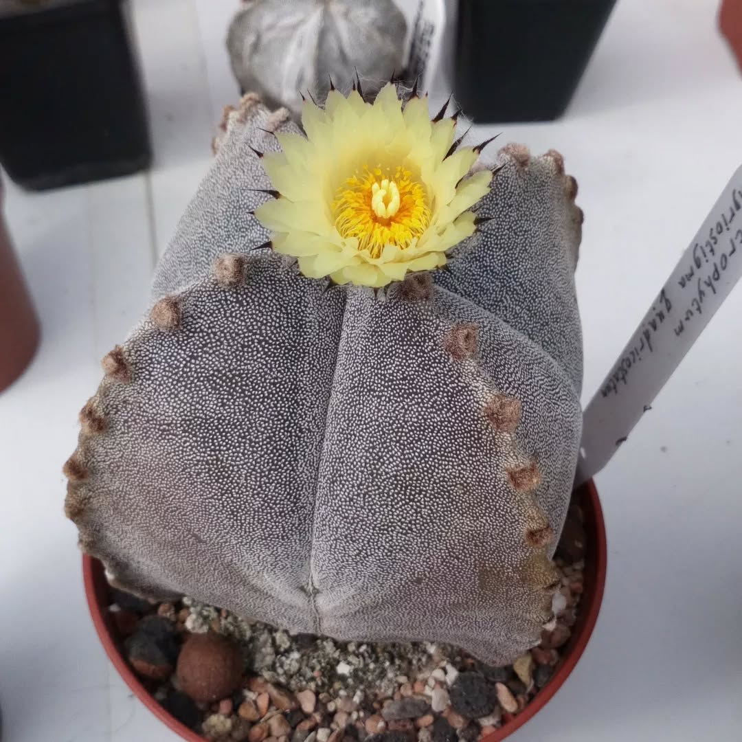 Four ribs is the entire morphological definition of this taxon. Young plants read as nearly square in cross-section, with four clean flat faces meeting at angles close to 90 degrees. This geometry is absent from any other Astrophytum species and absent from the typical five-ribbed A. myriostigma. Everything else belongs to the parent species and is shared without modification: white trichome flecking, pale yellow flowers with an orange throat, eventual columnar growth, cold tolerance.