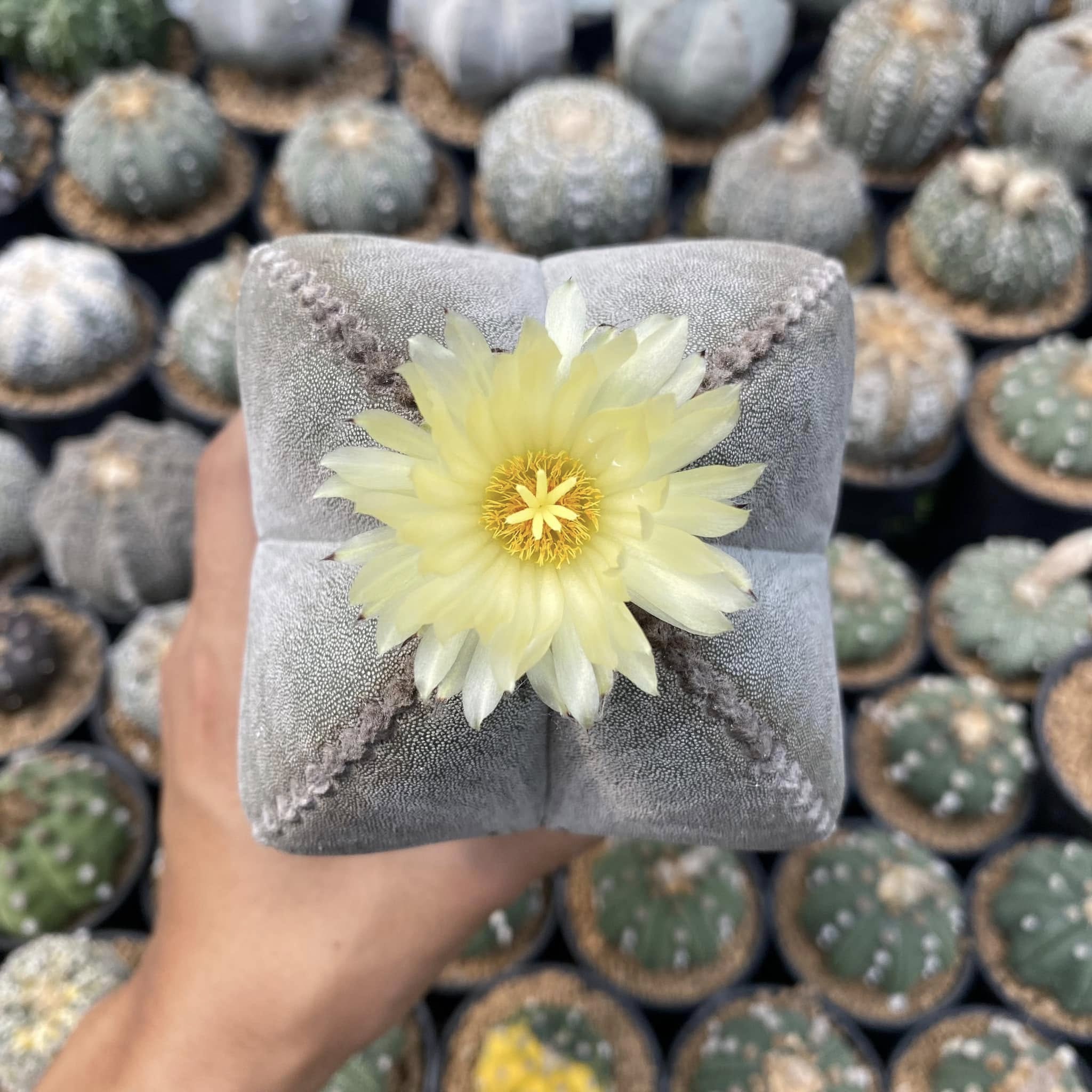 Flowers from Jaumave wild plants are slightly smaller than those of typical A. myriostigma, with one to three tepal rows and pale whitish-yellow coloration (Montanucci and Kleszewski 2019). Cultivated quadricostatum plants show the standard myriostigma flower: 4–6 cm diameter, pale yellow to creamy tepals with an orange throat, arising apically. First flowering occurs at roughly six years from seed.