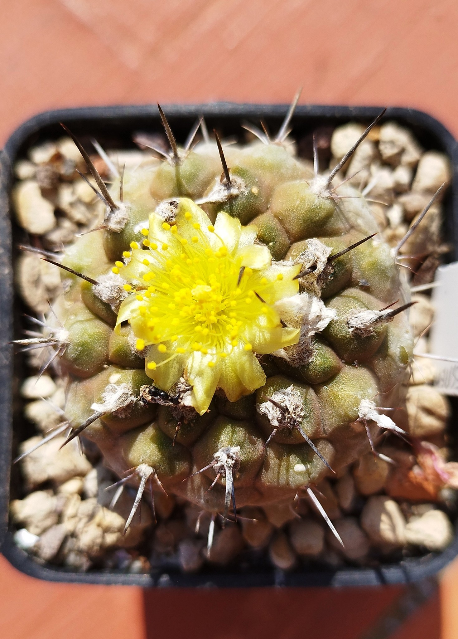 Copiapoa esmeraldana is slow but not as glacial as Copiapoa solaris. In cultivation, it reaches flowering size within 5 to 8 years from seed under good conditions. The scented, broadly bell-shaped yellow flowers are one of the genuine rewards of growing this species. They open during the day and carry a detectable fragrance that is uncommon among Copiapoa.