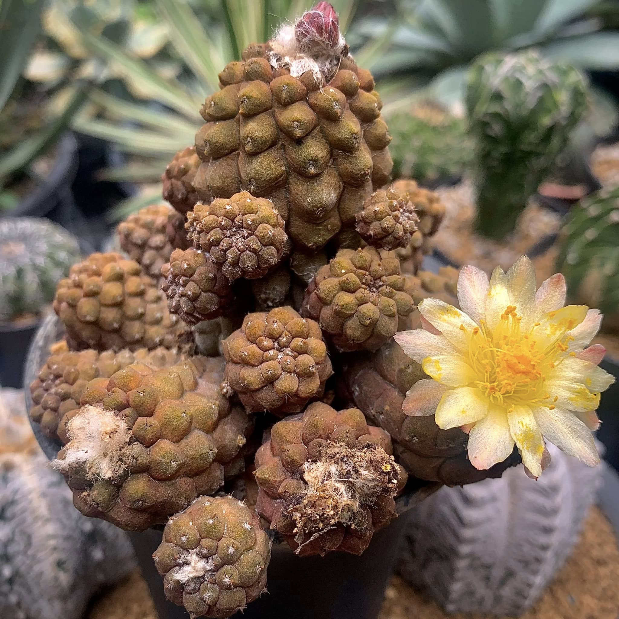 The smooth epidermis, low tubercles, and bronzed body color develop best under strong light and lean conditions. Plants grown in shade or with excessive watering produce greener, softer bodies that lack the desert character of well-grown specimens. The clustering habit of barquitensis means that patience produces a multi-headed mound over time: 4 to 5 heads in a decade, each with its own sunken woolly apex, is a realistic expectation for a well-managed seed grown plant.