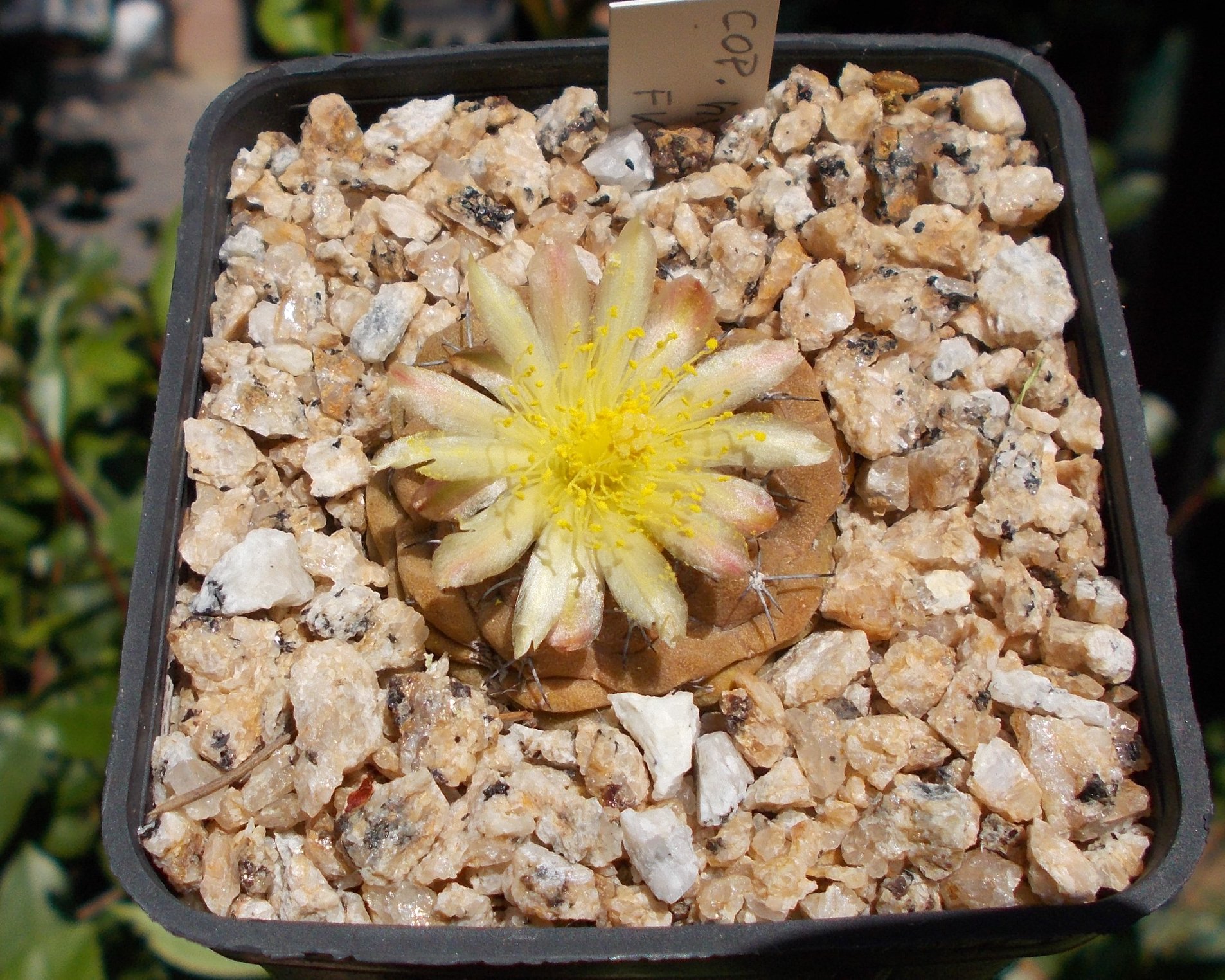 Mature seed grown Copiapoa hypogaea var. barquitensis in deep pot showing multiple clustering heads with smooth bronzed epidermis in mineral substrate
