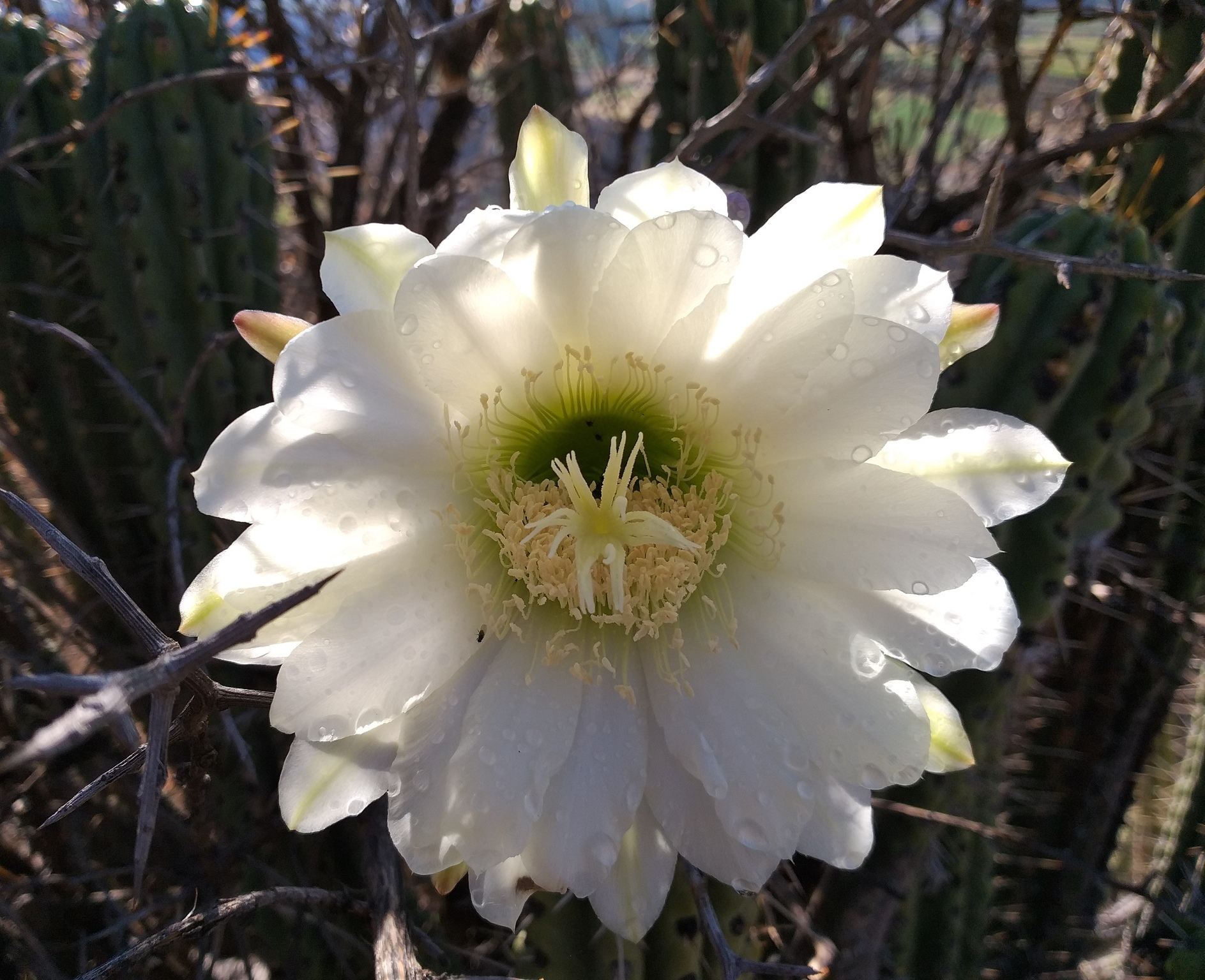 Flowers are nocturnal and funnel-shaped, white, 12–14 cm long and up to 16 cm in diameter when fully open (trichocereus.net). The floral tube is green, 7–8 cm long, and fragrant (Botanico Hub). Flowers persist until the following morning. The species is self-sterile; two genetically distinct plants are required for seed production.