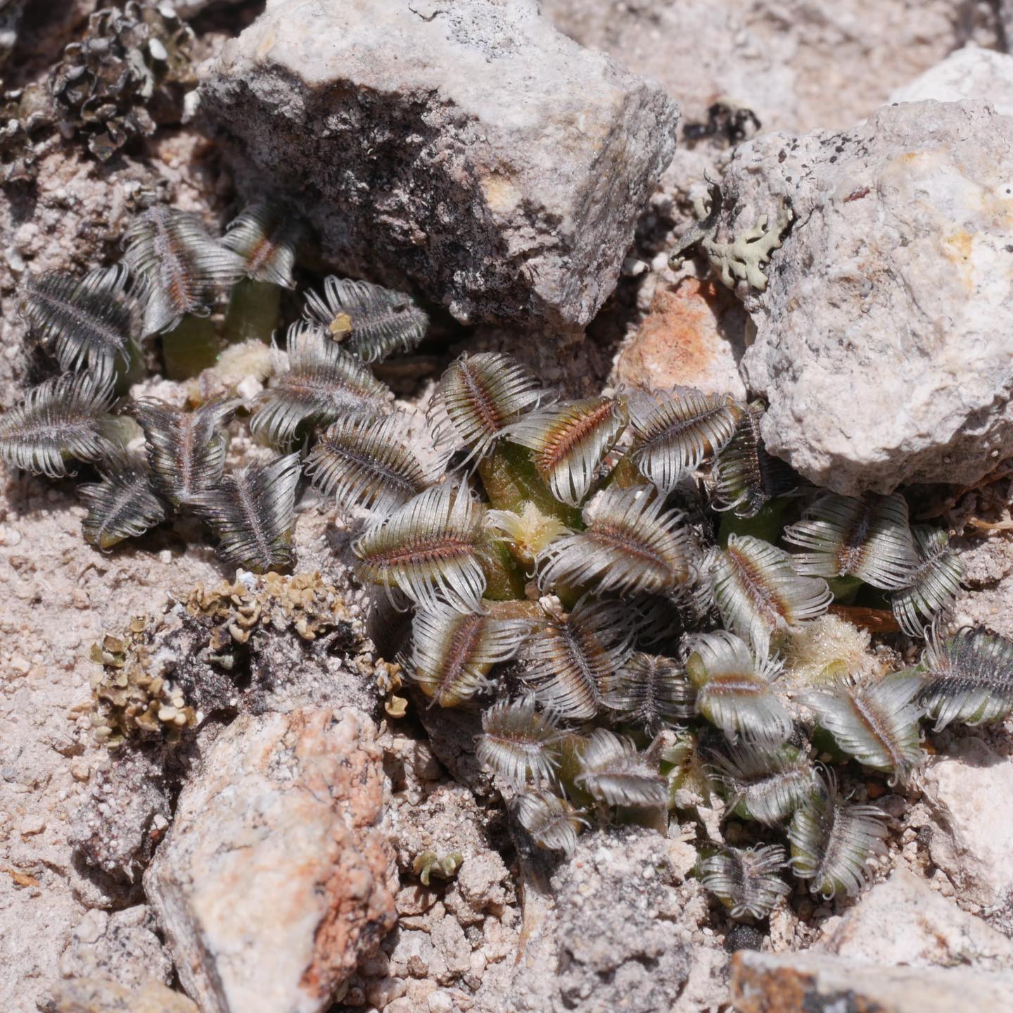 Stems are solitary or in small clusters of a few heads, spherical with a flattened apex, and rarely more than 3 cm across in habitat. Cultivated plants on a fast rootstock bulk up quickly; seed grown plants hold well below 2 cm for years before approaching wild size. The visible body is a disc of slender tubercles with strongly elongated areoles carrying pectinate spines at the tips; there are no central spines, and the overall look is of a pectinate mat flush with the substrate.