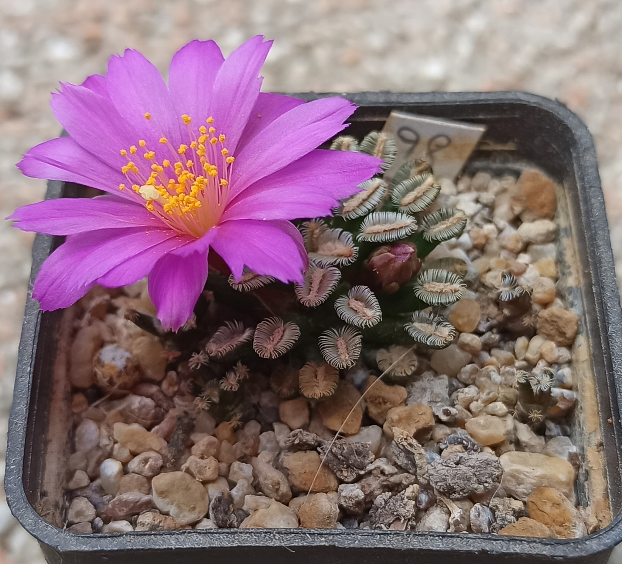 Grafted stock can flower within the first two years on the rootstock, often at a body diameter under 1 cm. Ungrafted plants flower much later, typically past the five-year mark and at a larger body diameter. The flowers are pink, crocus-like, and funnelform, often wider than the plant itself; the overreaching flower-to-body ratio is part of the species’ visual signature.