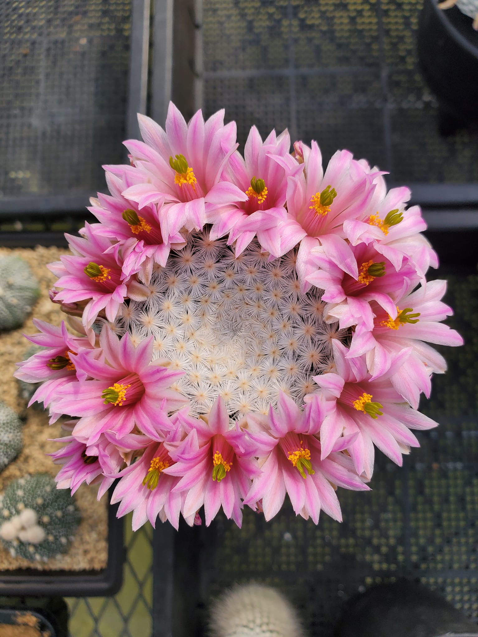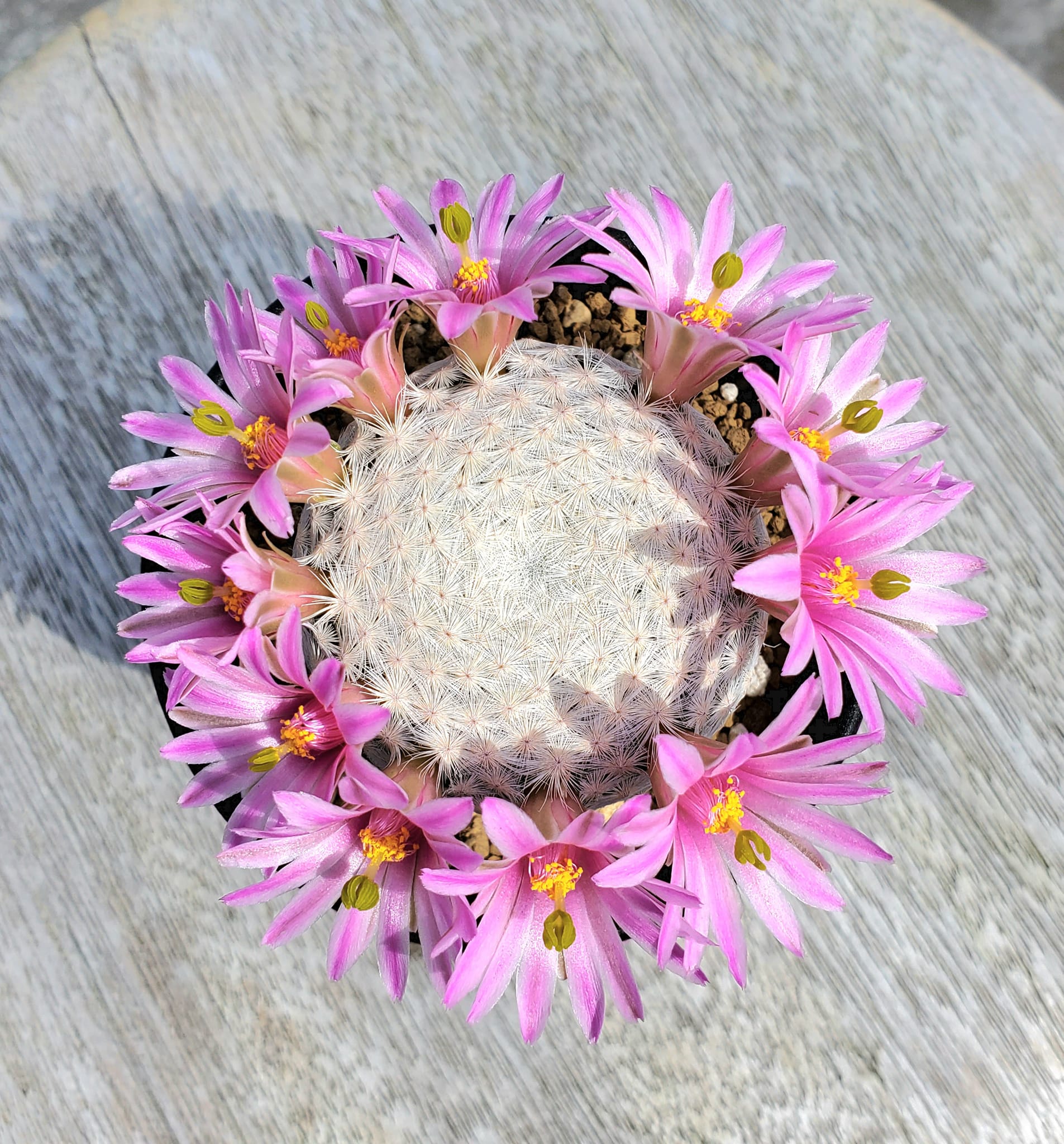 The body is a white globe of 2 to 3.5 cm in habitat, wrapped in a hundred or more bristly white to grey radial spines that interlace tightly enough to hide the epidermis. There are no central spines. In April and May the crown produces one to several funnelform flowers of 20 to 25 mm, pale pink to red-violet, disproportionately large for the stem they sit on. The effect reads instantly as a miniature version of the much more variable Mammillaria napina floral display, and that is part of why serious collectors care about it.