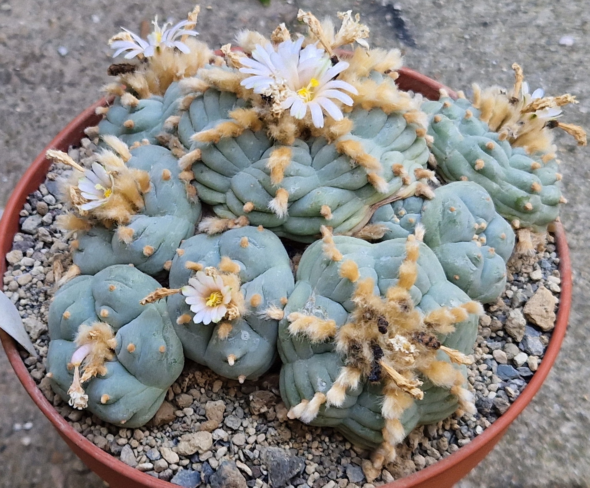 var. caespitosa is worth a special mention here. Under natural conditions and in cultivation, some plants of L. williamsii produce multiple crowns from a single root system, forming dense clusters of closely packed heads. This multi-headed habit is referred to as caespitose. In some populations, notably those from certain San Luis Potosí localities, caespitose plants are common enough to be considered a regional characteristic. In others they appear only rarely. A cluster plant of 20 or more heads on a single root system, grown over many years, is one of the more impressive sights in a peyote collection.